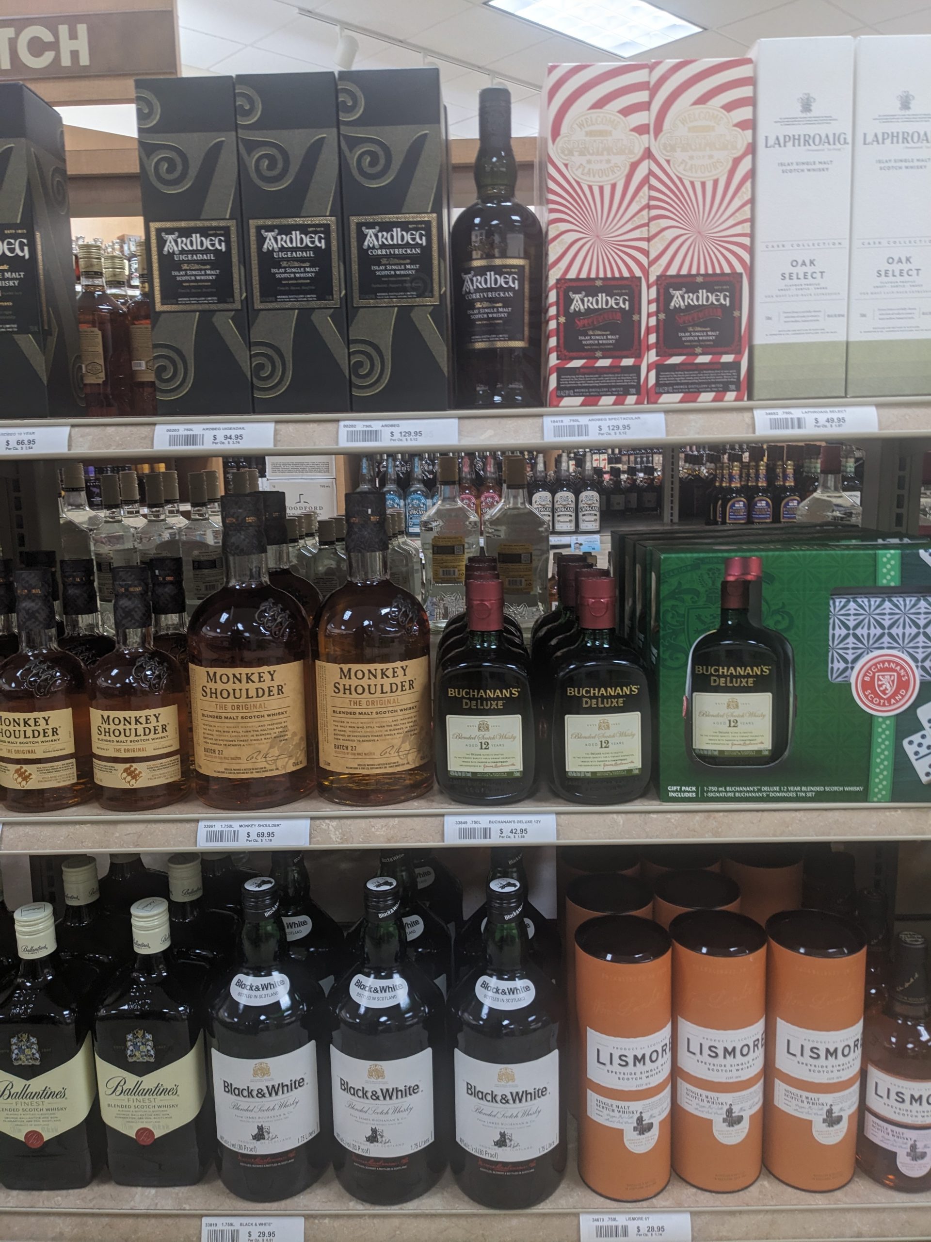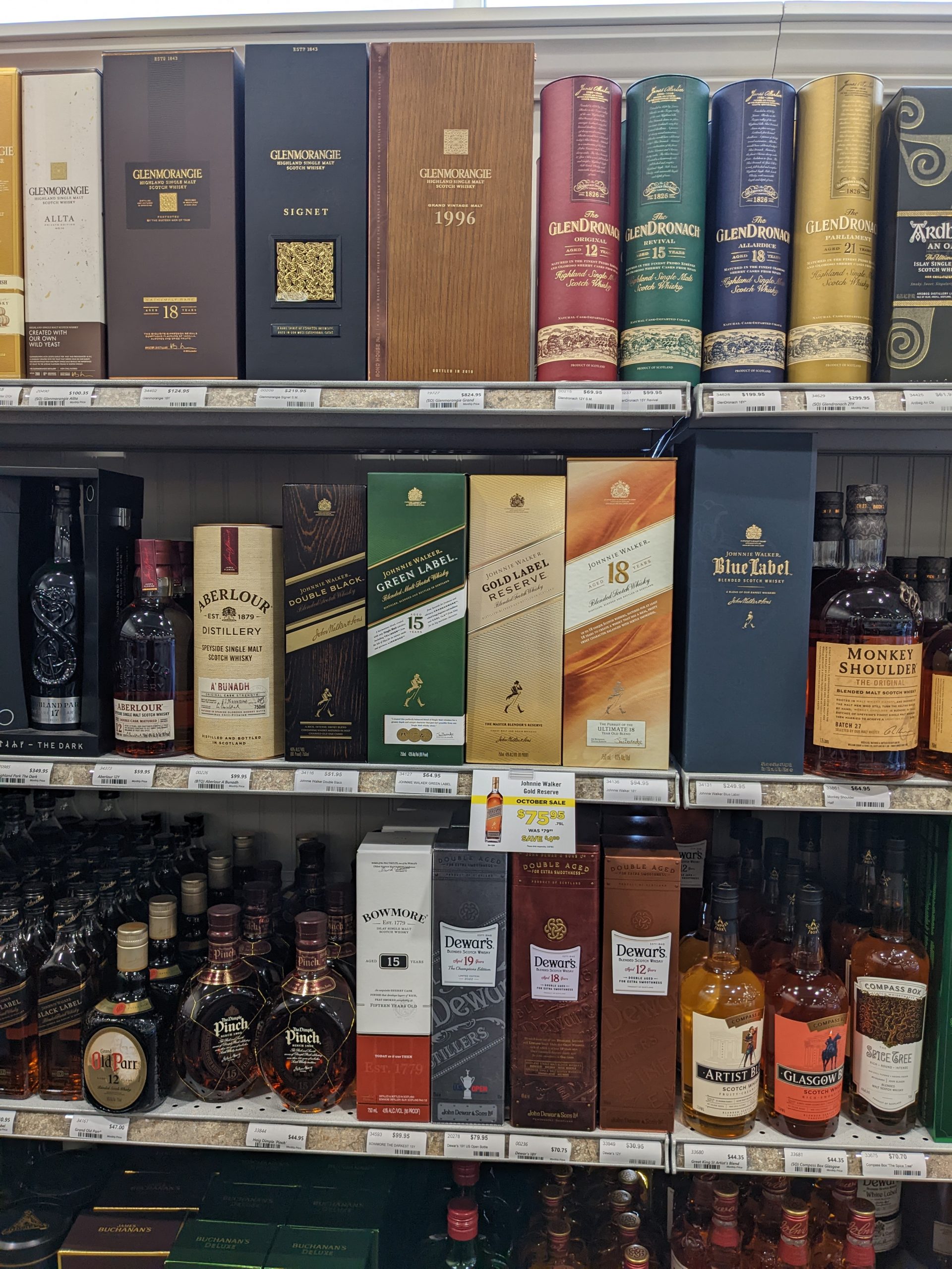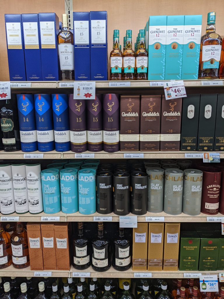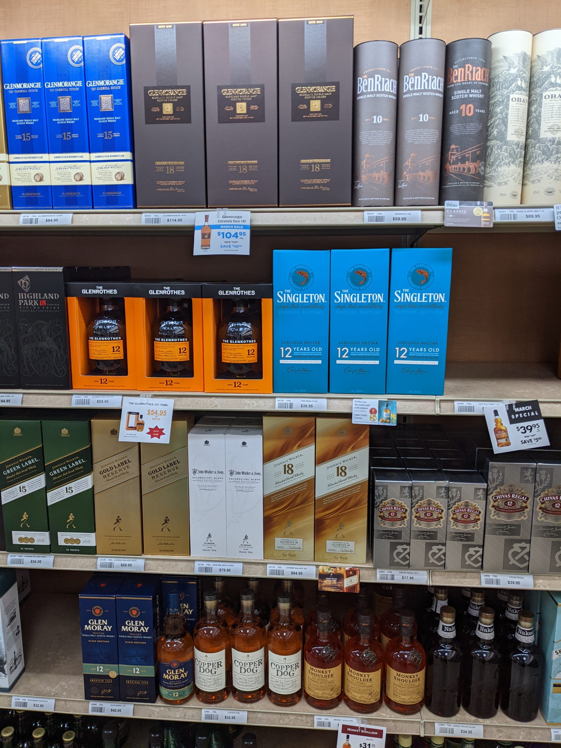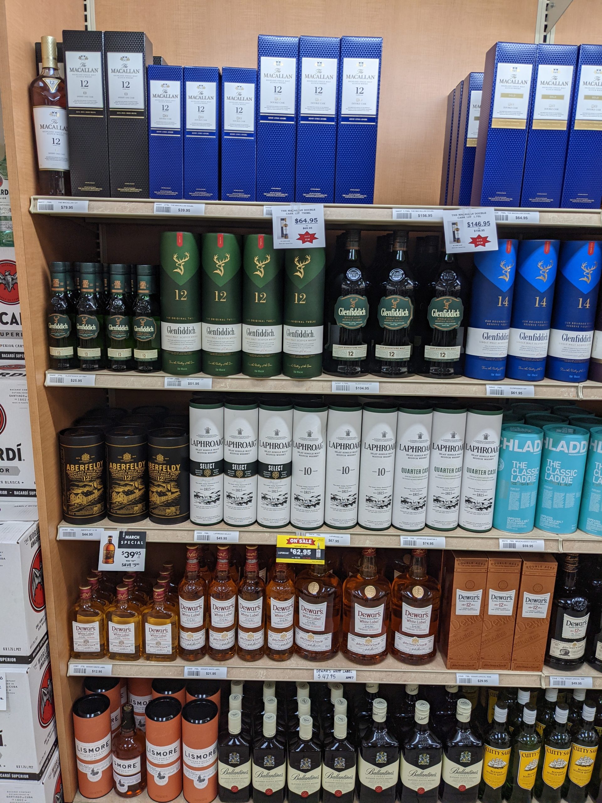 Cell phone photos of retail whisky shelves are a quick and easy way to take notes and create a reference point in the timeline of history. When these snapshots get old enough, I think it will be fun to see the changes in pricing, branding, and availability of whiskies. Comparing them to your local whisky retailer may also be interesting. All photos are my own, and archived here in chronological order. The resolution is high enough to view prices and some label text.